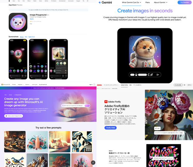 主要OSメーカーのOS標準の画像生成AIツールの紹介ページ、アップル社のImage Playground、グーグル社のGemini、マイクロソフト社のMicrosoft Designerだ。過剰なまでの色の使い方、動物のリアルさを保ったまま可愛らしさを誇張する絵の表現など、彼らが非常に近くて似通った表現の振れ幅を持った人たち——私の私見で判断させてもらえればアメリカンテイストの絵柄を足場に、これらのツールを作っていることは明白だ。