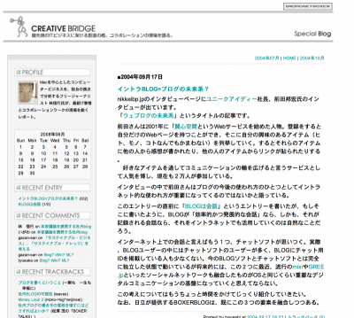 その「ビジネスブログ」という概念の誕生にかなり関わり、普及にも積極的に務めたのが、小川浩さんだが、その後、小川さんが「ブログ」を知るキッカケになったのが、私のMACPOWERの記事だった、と聞いたときは、ほんのちょっとでも世の中に貢献できた気がして、とてつもなく嬉しかった。