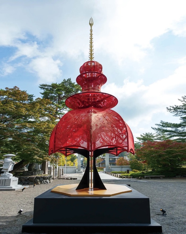 このように「スキン シリーズ」を建造物に使った例はこれまでにもあり、2023 年には高野山で開催された芸術祭「高野山アートデイズ 2023」で曼荼羅を立体的に展開した仏塔、「Mandala Tower」を製作した(STUDY 05 )。大きな構造体だったが、中央には塔があり高い台座の上に置かれているために制作者以外は中に入ることができなかった。