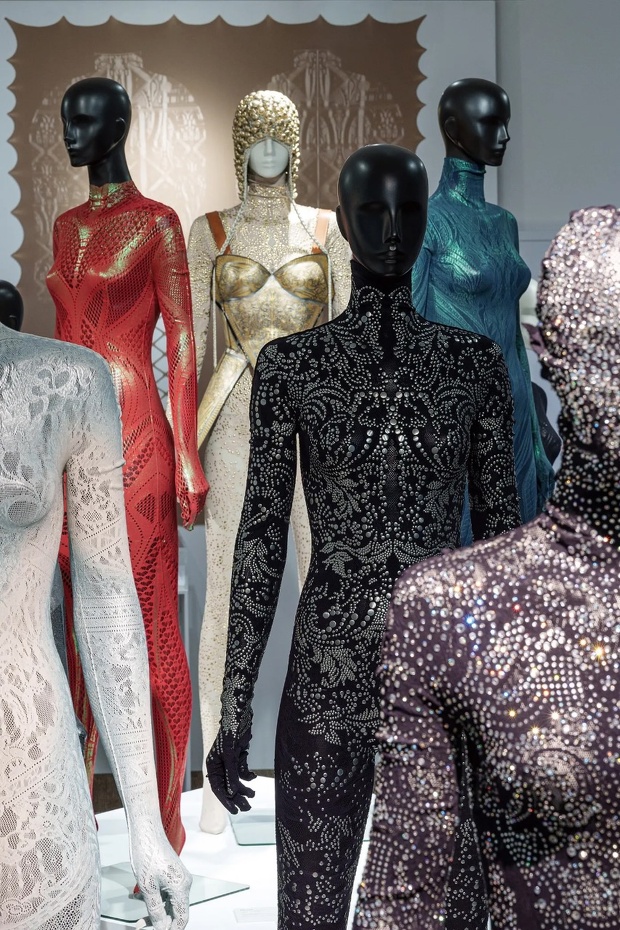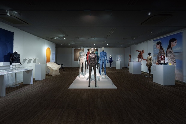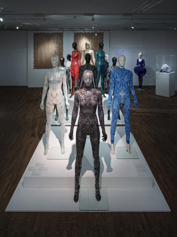 「皮膚のデザイン」展は「スキン シリーズ」が展示の中心となっており、会場の外からも見える入り口正面では、これを纏った11 体のマネキンが来場者を出迎えてくれる。見渡すとひとくちに「スキン シリーズ」といっても多様なバリエーションがあることに驚かされるはずだ。