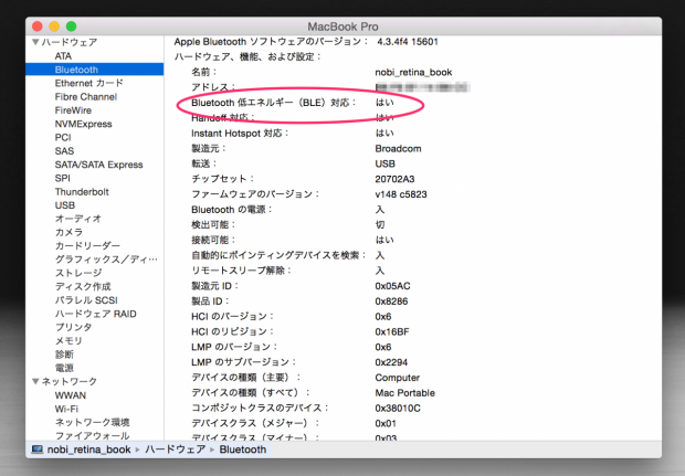 アップルメニューから「このMacについて」を選び、「システムレポート」ボタンを押し、Bluetoothの項目で、「Bluetooth低エネルギー」が「はい」になっていることを確認しておいてください。